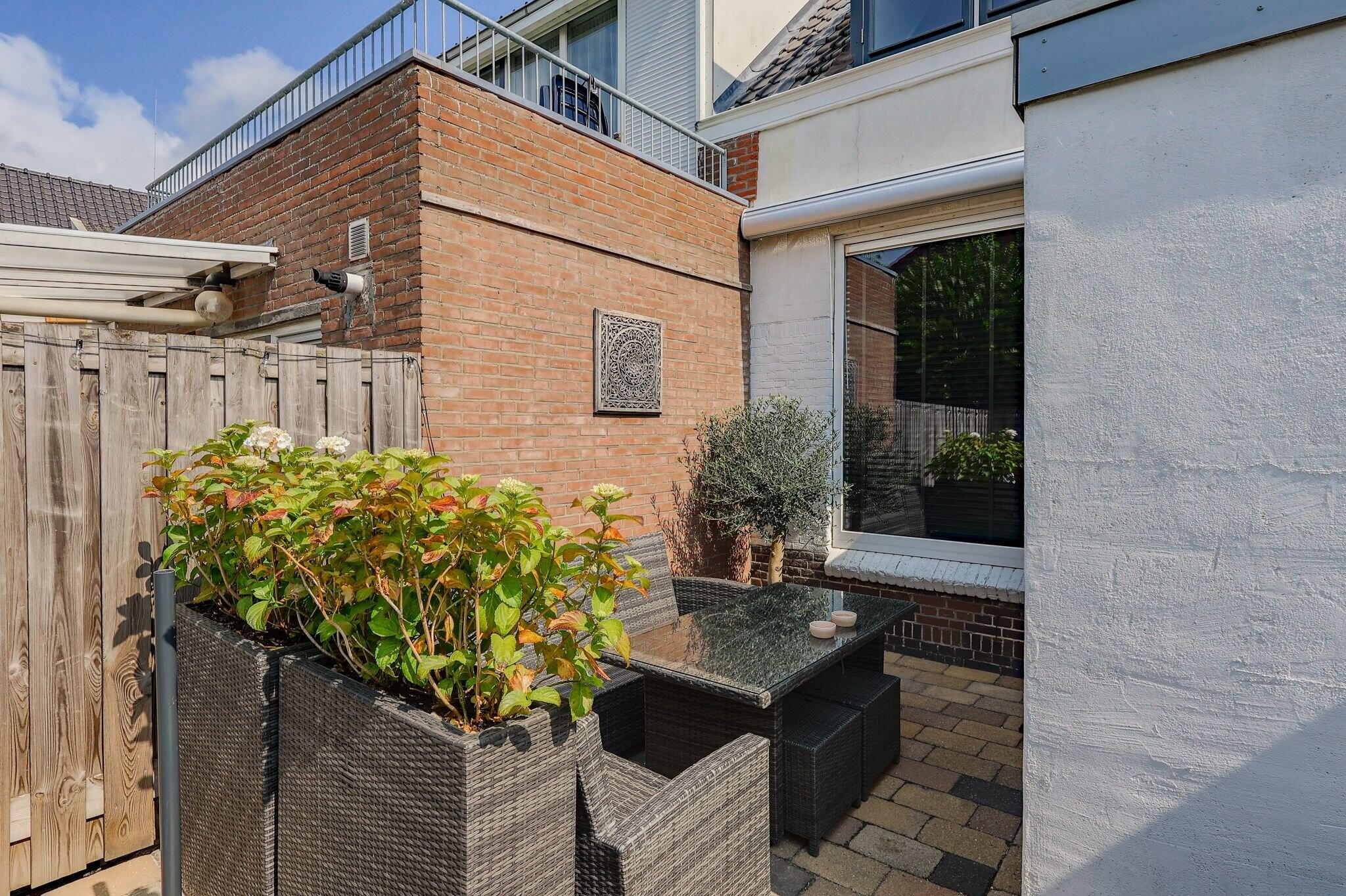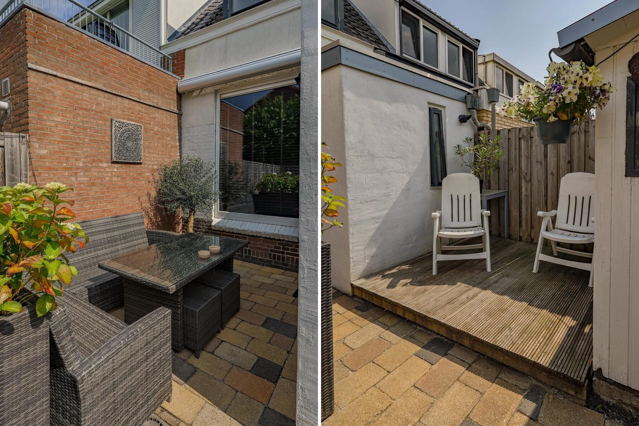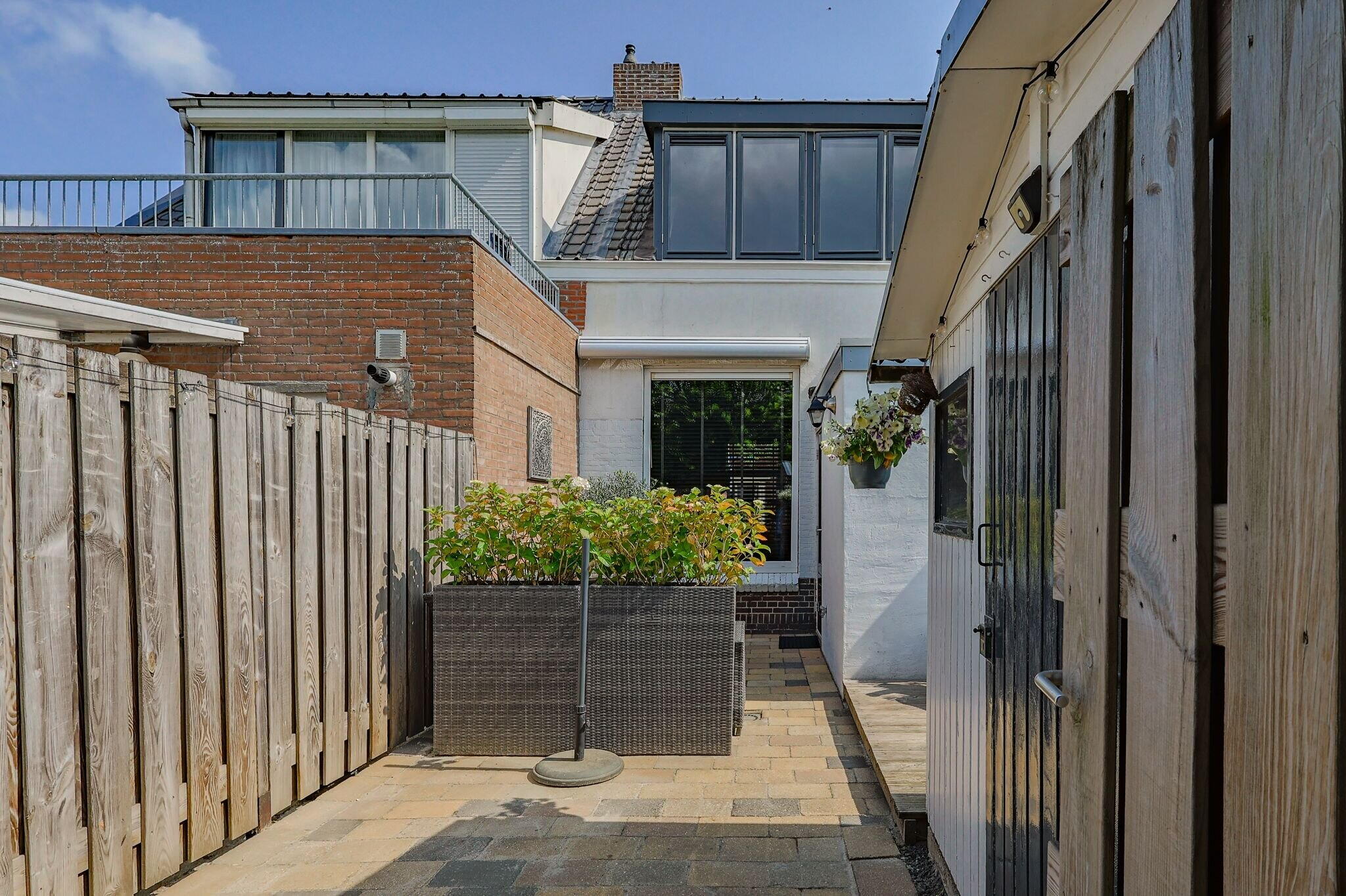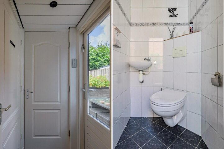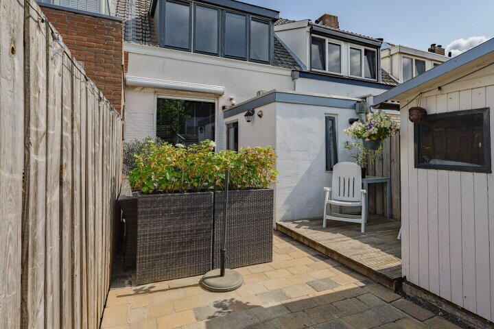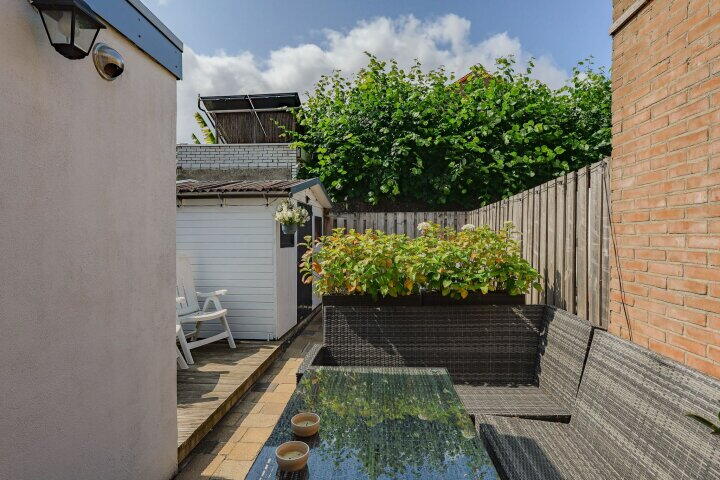 De volledig omheinde achtertuin is gelegen op het zonnige zuiden, waardoor je hier vrijwel de hele dag van de zon kunt genieten. De tuin is onderhoudsvriendelijk aangelegd met sierbestrating en vlonderplanken en beschikt over een handige achterom, wateraansluiting, elektra en een ruime blokhut (ca. 2,67 x 1,84 m) voorzien van stroom – ideaal voor extra opslag of als werk-/hobbyruimte. Aan de achtergevel is een elektrisch zonnescherm geplaatst, waarmee je eenvoudig schaduw creëert op warme dagen en extra comfort toevoegt aan het buitenleven.